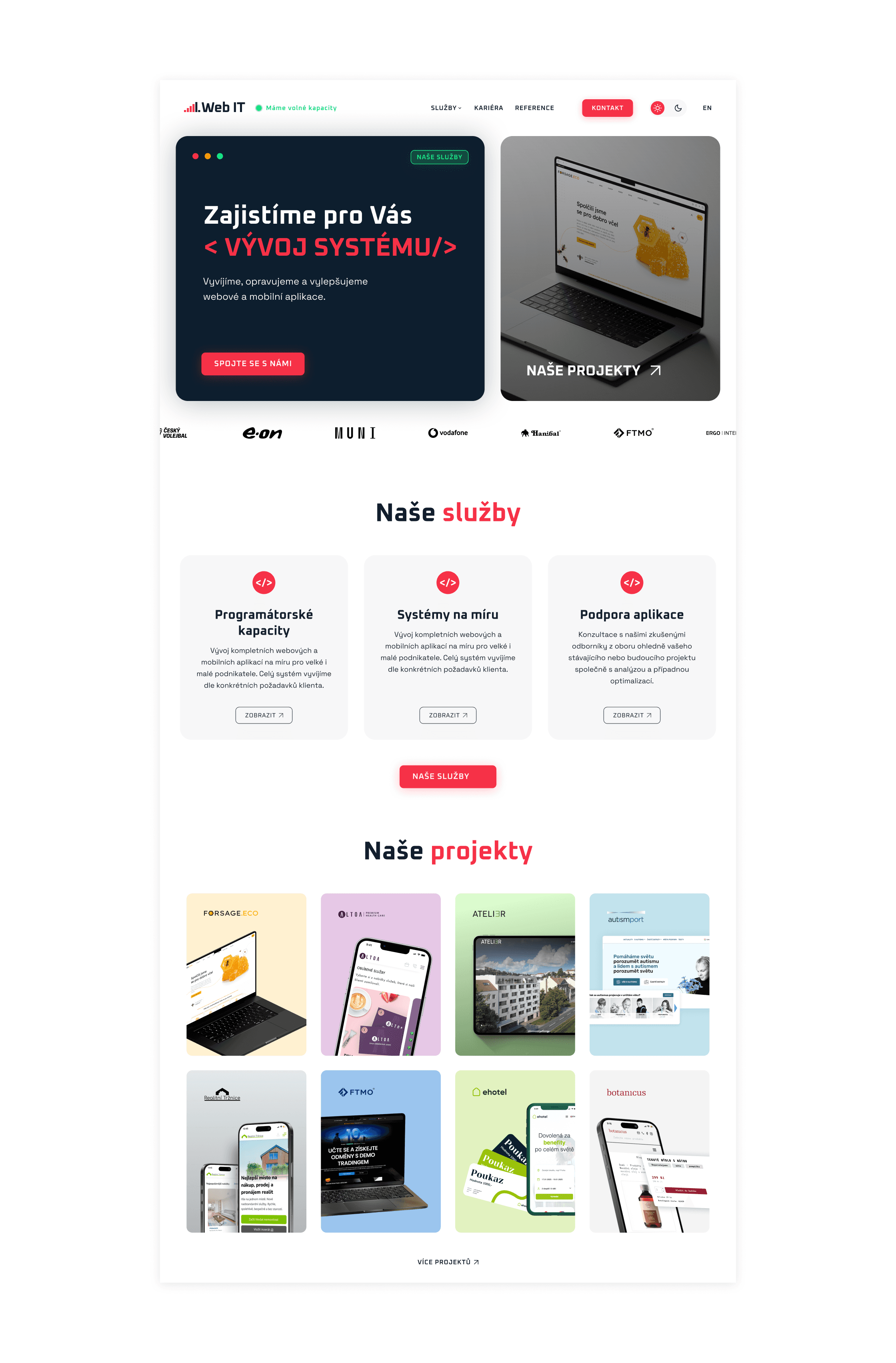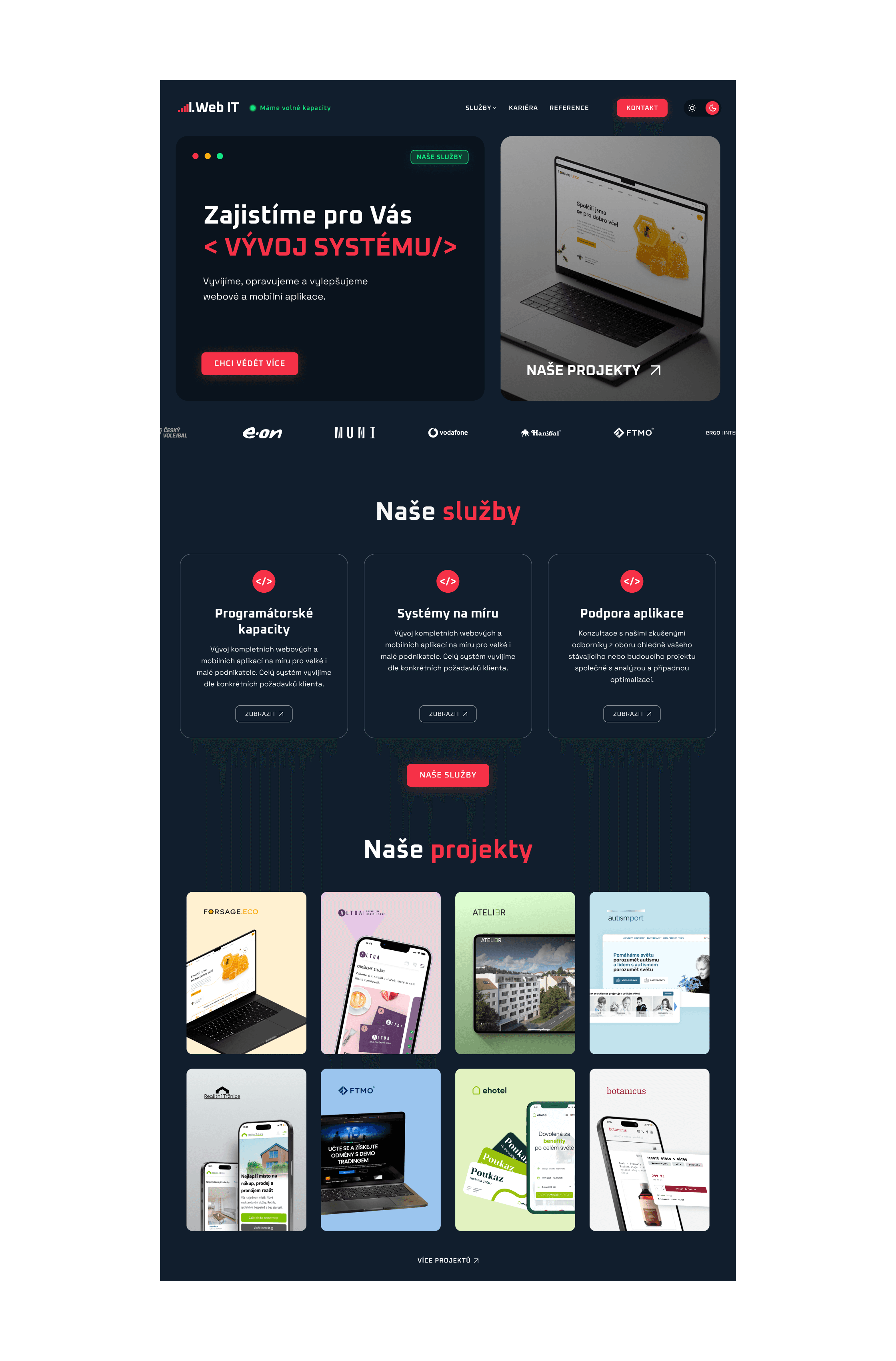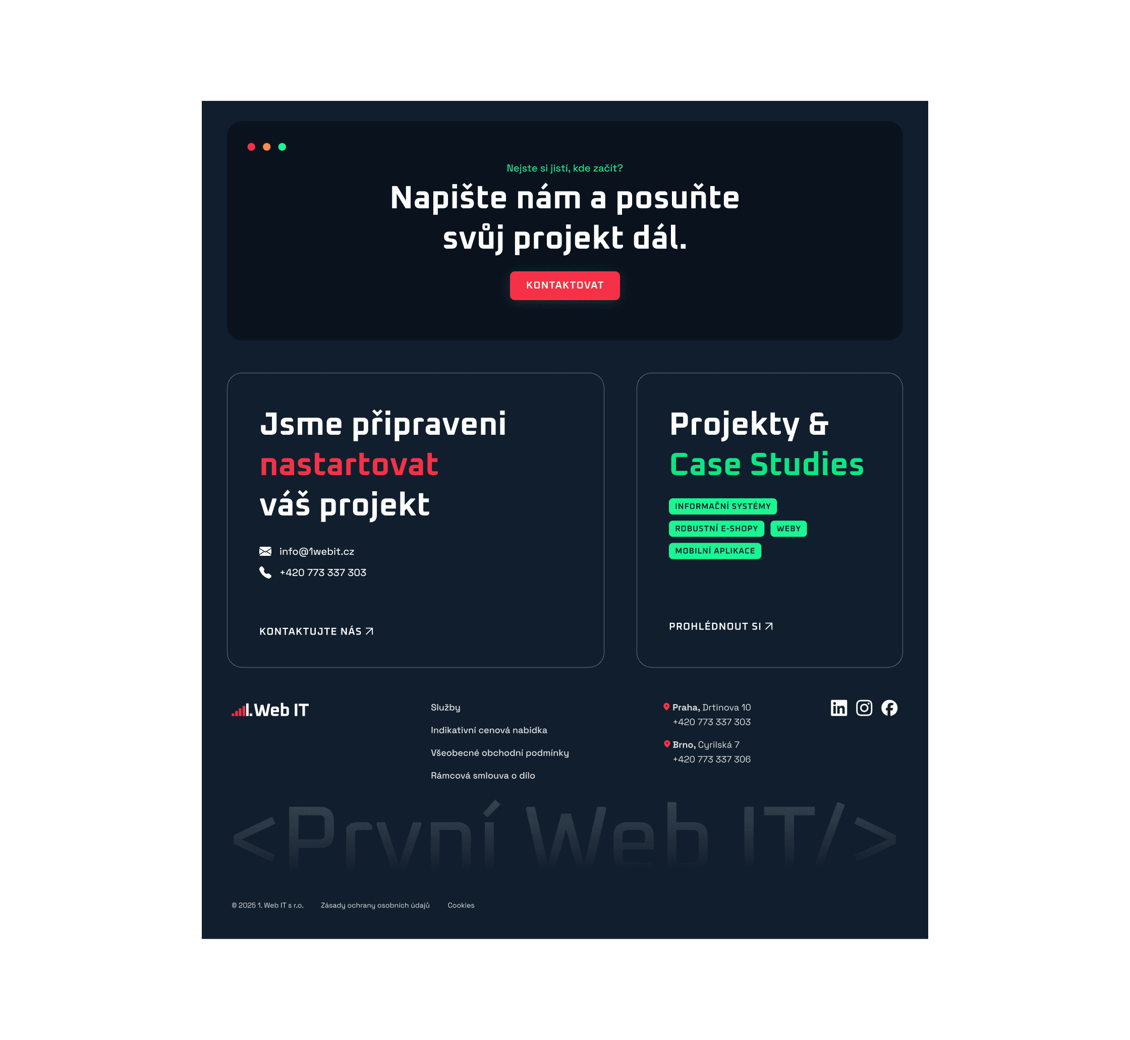 Pro firmu 1. Web IT s.r.o. jsem vytvořila kompletní redesign webu i refresh značky. Vycházela jsem z vývojářského DNA firmy a pracovala s vizuálními metaforami typickými pro IT svět – například dialogová okna prohlížeče jsem využila jako CTA sekce. Nový vizuál přinesl značce svěží, moderní směr a jasnější hlas. S týmem 1. Web IT nadále úzce spolupracuji na dalším rozvoji a posouvání značky, aby si zachovala autenticitu a dokázala se přirozeně vyvíjet.